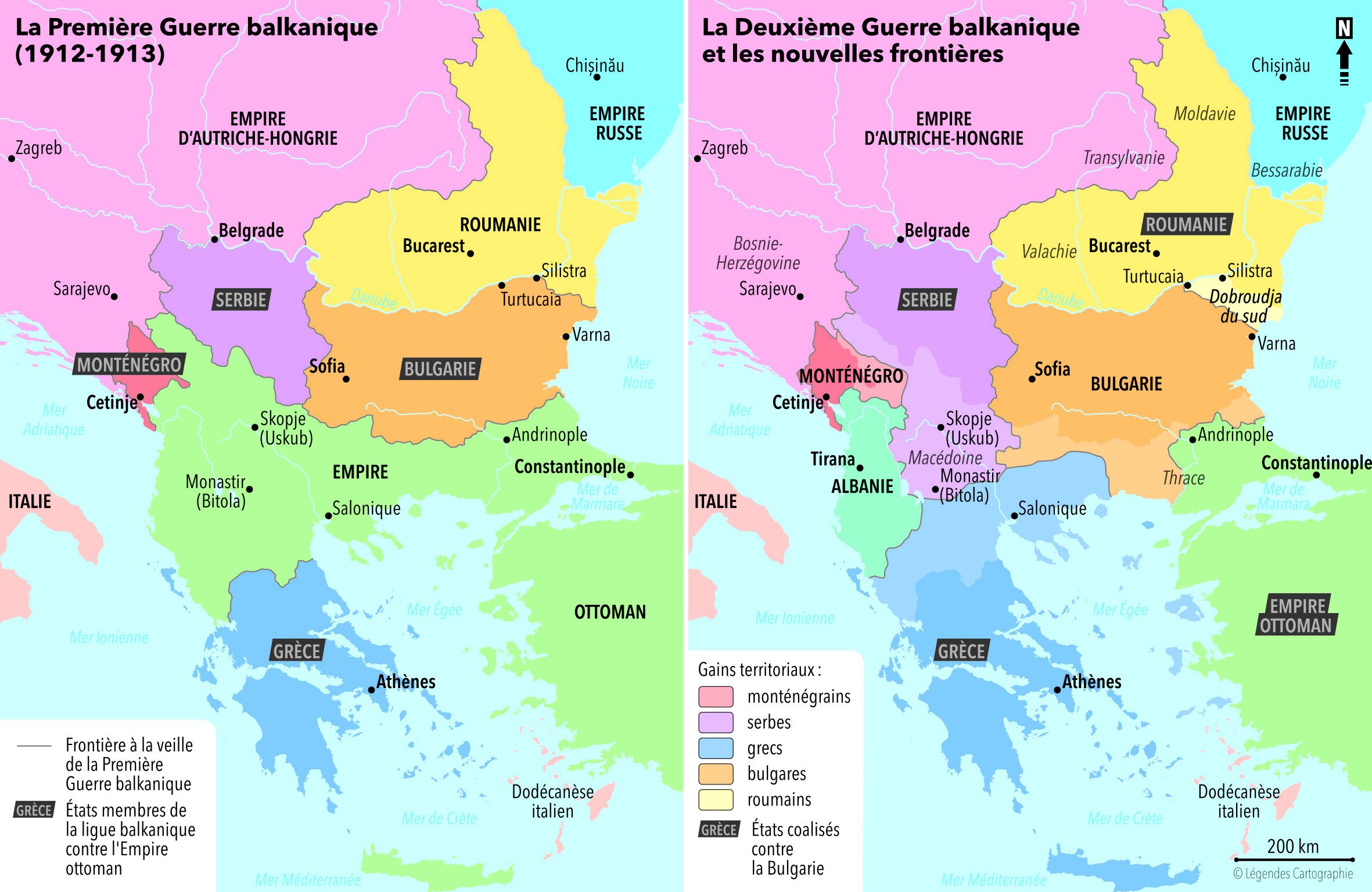 À droite : La Deuxième Guerre balkanique (juin-juillet 1913) et les nouvelles frontières